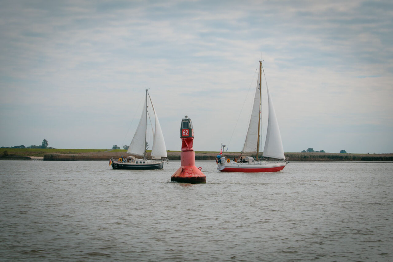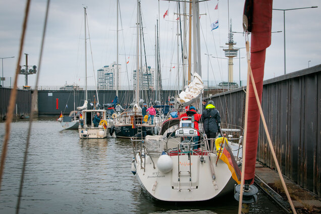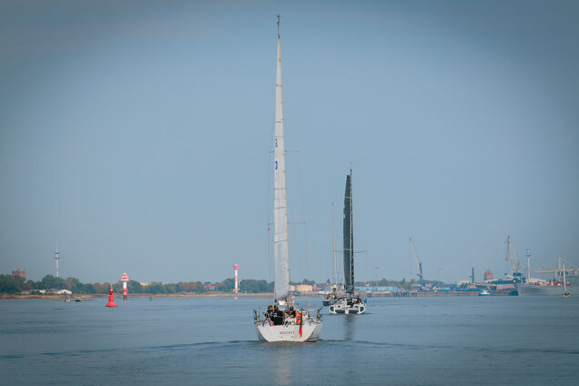Insgesamt 23 Boote nahmen an der Ausfahrt teil, wobei einige Crews Gäste an Bord hatten. Start war am Samstag um 13:00 Uhr im Weser Yacht Club. Für die große Zahl an Schiffen wurde eigens die große Kammer der Doppelschleuse geöffnet, sodass alle Boote gemeinsam ausschleusen konnten – ein beeindruckendes Bild, das den besonderen Charakter dieser Fahrt unterstrich. Bereits im Vorhafen setzten die ersten Crews ihre Segel, andere folgten etwas später. Bei drei Windstärken aus östlichen Richtungen konnten die Yachten fast bis Vegesack unter Segeln fahren. Zwar zeigte sich die Sonne nicht so strahlend wie erhofft, doch die Windbedingungen sorgten für echte Segelfreude und eine ausgelassene Stimmung auf dem Wasser.