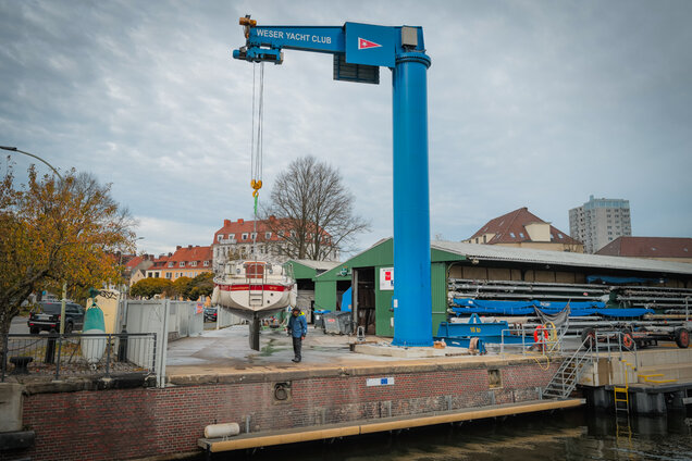 Am Rande des Geschehens steht der moderne Kran, der inzwischen fast zwei Jahre im Einsatz ist. Bereits bei seiner Fertigstellung im März 2024 hatte der 1. Vorsitzende Dr. Roland Behrens betont, wie wichtig diese Investition für den Verein sei: „Der neue Kran verbessert nicht nur die Abläufe im Hafenbetrieb, sondern ist auch ein Symbol für die Zukunftsfähigkeit des Weser Yacht Club.“ Seine Worte haben sich bewahrheitet – das Gerät hat sich seither als zuverlässiges Arbeitsmittel etabliert und erleichtert dem Bootsmann die intensive Auskran-Phase erheblich.